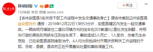 据吉林省延边州安图县@安图发布 通报:2019年12月22日13时53分许,安图县辖区内发生一起交通事故。一辆由明月镇驶往二道白河镇方向的挂车在203省道8公里处发生侧翻,将相向行驶的黑色别克轿车压到挂车底下,事故造成3人死亡,1人受伤,伤者无生命危险,已在安图县医院接受治疗。4人均为到包保村开展扶贫帮扶工作返程的干部。目前,县委、县政府正在开展善后处置和事故调查工作。