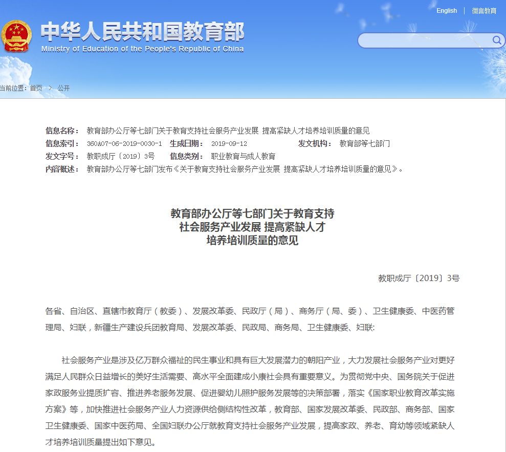 2019年9月,教育部办公厅等七部门印发的《关于教育支持社会服务产业发展 提高紧缺人才培养培训质量的意见》指出,社会服务产业是涉及亿万群众福祉的民生事业和具有巨大发展潜力的朝阳产业。