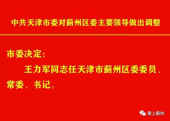 新京报快讯 据天津市蓟州区委宣传部消息,天津市委对蓟州区委主要领导做出调整,天津市委决定,王力军同志任天津市蓟州区委委员、党委、书记。