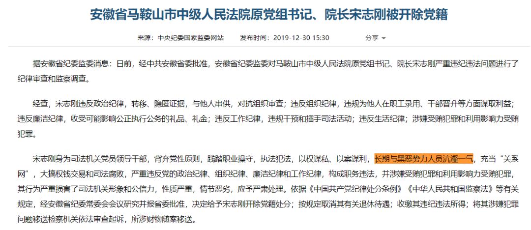 12月30日,安徽省马鞍山市中级人民法院原党组书记、院长宋志刚被开除党籍并取消退休待遇。通报中说他“长期与黑恶势力人员沆瀣一气”。 同天,黑龙江省纪委监委发布消息,友谊县人大常委会原副主任田凤山被双开,通报也提到他“与黑社会性质组织成员沆瀣一气”。