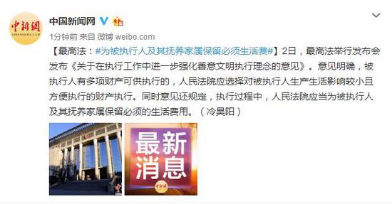 2日,最高法举行发布会发布《关于在执行工作中进一步强化善意文明执行理念的意见》。意见明确,被执行人有多项财产可供执行的,人民法院应选择对被执行人生产生活影响较小且方便执行的财产执行。同时意见还规定,执行过程中,人民法院应当为被执行人及其抚养家属保留必须的生活费用。(冷昊阳)