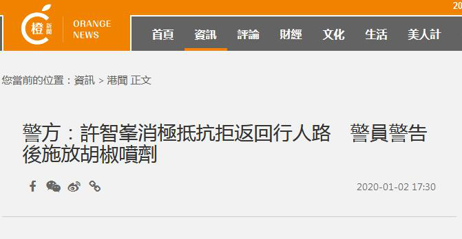 据香港“橙新闻”报道,江永祥2日说,警方昨晚8时在铜锣湾进行驱散行动,警方作出多次警告要求群众离去,但部分人没有听从,包括许智峯,他当时并没有依循警方指示返回行人路,态度不合作,并作消极性的抵抗,与警员纠缠。