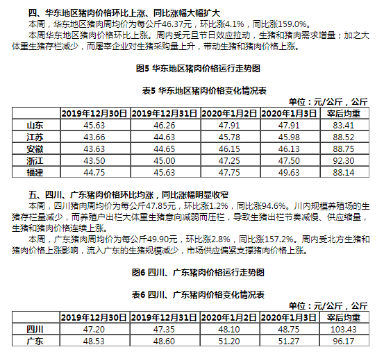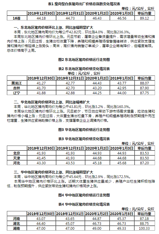 中国网财经1月7日讯 据农业农村部网站消息,据农业农村部信息中心和山东卓创资讯股份有限公司联合监测,2020年第1周(即2019年12月30日-2020年1月3日,以下简称本周),16省(直辖市)瘦肉型白条猪肉出厂价格总指数的周平均值为每公斤45.48元,环比涨3.4%,同比涨159.7%。