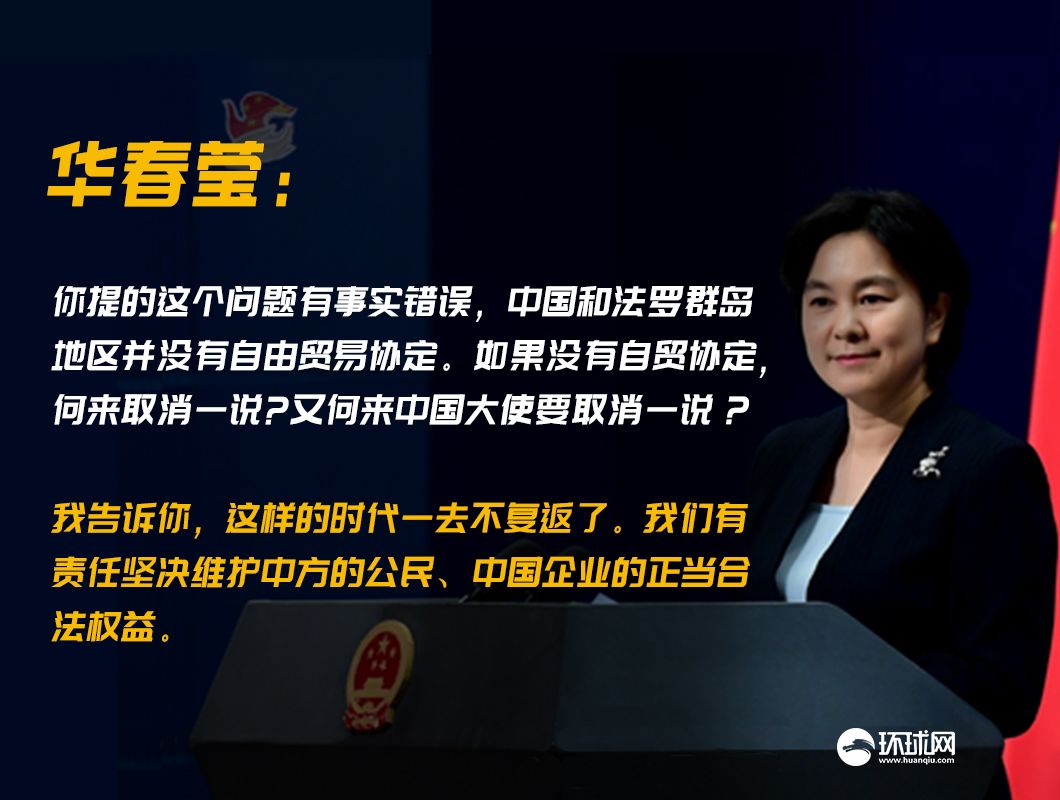 华春莹表示,你提的这个问题有事实错误,中国和法罗群岛地区并没有自由贸易协定。如果没有自贸协定,何来取消一说?又何来中国大使要取消一说?但是如果你关注美国,它的高官在满世界范围抹黑和攻击中国的企业,威胁有关国家不要与中国特定企业开展合作,你就能真正的理解什么才是威胁。据我了解,中国和法罗群岛地区有着良好的合作关系,中国驻丹麦大使同法罗群岛官员的会面是正常的履职,谈的是友好与合作,维护的是中国企业的正当合法权益。你提到的有关媒体报道的内容有误,完全是别有用心。