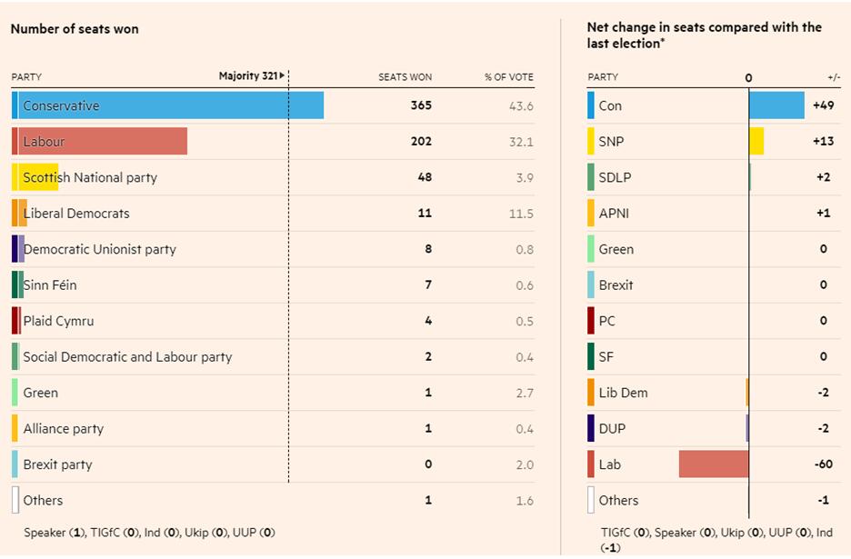 在12月12日举行的英国大选中,鲍里斯•约翰逊领导的保守党获得了英国议会下院650个议席中的365个席位,彻底结束了最近十年中多数时候英国存在的“悬浮议会”局面。此次选举也是保守党自1987年以来取得的最大胜利,工党则面临1935年以来最严重的失败。