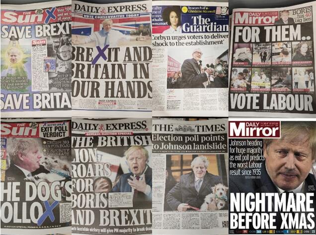 12月12日,带有不同政治倾向的报刊分别为保守党和工党助威(第一行四张图片);12月13日,各大报纸纷纷报道了保守党的大胜(第二行四张图片)。左侧《太阳报》(The Sun)和《每日快报》(Daily Express)偏向于支持保守党,右侧《卫报》(The Guardian)和《每日镜报》(Daily Mirror)则偏向于支持工党。