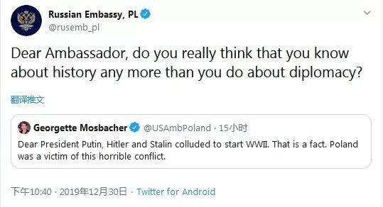 不过不久后,俄罗斯驻波兰大使馆官方推特就发帖回呛莫斯巴彻,调侃称“比起外交,你真觉得自己更懂历史?”↓