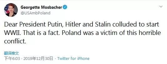 12月30日,莫斯巴彻在推特上发文“喊话”普京,将挑起“二战”的矛头直指希特勒和苏联前领导人斯大林,“希特勒和斯大林共同发起了世界第二次大战。这是事实。波兰是这场可怕冲突中的受害者。”↓