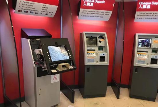 而轩尼诗道汇丰银行理财易中心,玻璃外墙亦被示威者打至碎裂,部分提款机、支票机被拆开,屏幕被打烂。