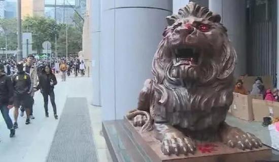英资银行汇丰也受到波及,中环汇丰银行总行外下午4时有铜狮像被示威者喷红漆及贴上抗议标语。
