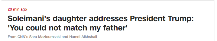 “你(特朗普)比不上我父亲,所以你用导弹瞄准了他。如果你配得上他,就该和他面对面对抗。” 苏莱曼尼的女儿这样说道。