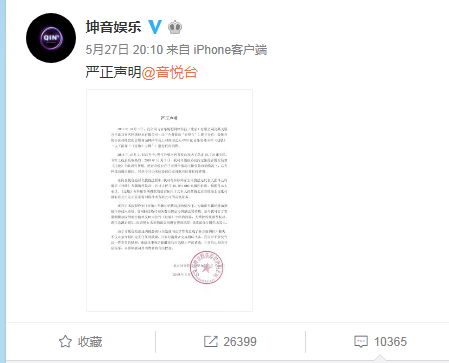 今年5月27日晚,北京坤音娱乐经纪有限公司(简称“坤音娱乐”)发布声明称,坤音娱乐委托音悦台在其经营的线上商城中代理销售该公司艺人的专辑,自2018年10月11日起陆续发送共计60500张专辑,在音悦台已经取得全部对应销售款项的情况下,坤音娱乐至今未收到任何结算费用。