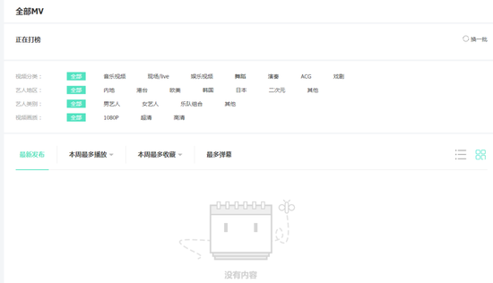 如今打开音悦台网站,首页显示的MV均已无法播放。查看其全部MV列表,显示“没有内容”。