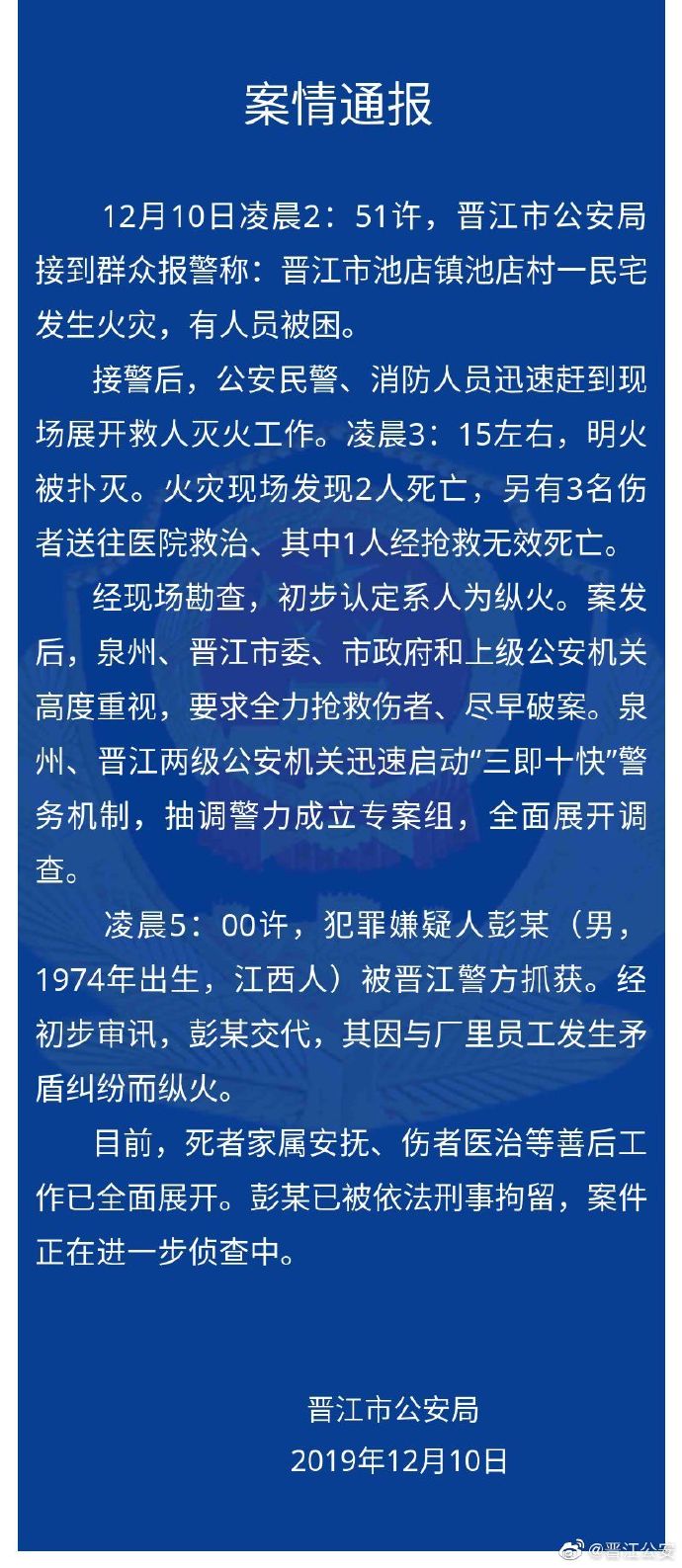 福建省晋江市公安局官方微博@晋江公安 12月10日发布案情通报称,当日凌晨发生一起纵火案,已致3人死亡,2人受伤。犯罪嫌疑人已被依法刑事拘留,案件正在进一步侦查中。