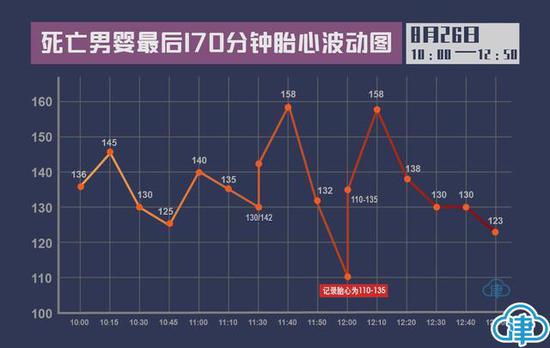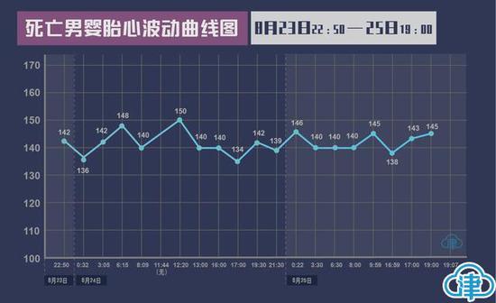 从孕期产检的胎心监护以及产前护理记录单来看,该胎儿胎心次数大多数时候都处在140-150的区间里,8月24日15点45分和16点检测的数据分别为160和162,此时有中度宫缩。记者根据胎心监护绘制了胎心数值波动曲线,发现8月26日的胎心数值波动明显大于8月23日至8月25日,且自8月26日中午12点10分胎心到达158后,此后40分钟内一直在下降,12点20分降至138,直至降到12点50分的123。