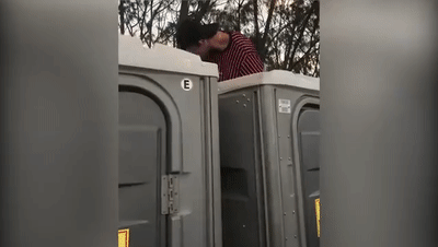 外国小伙爬上流动厕所踩烂顶部 掉下砸中入厕女