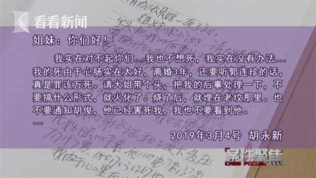 胡永新渐渐崩溃了,他寄希望于儿子胡俊能联系家里,还上钱。可惜儿子向来只有单线联系。只在缺钱的时候,用公用电话问家里要钱。至于家里发生了什么,爹妈怎么样了,绝对不会问一声的。胡俊也从来不回家。胡永新一直等到3月4日,没有任何消息,他绝望了。于是,他写下了遗书。