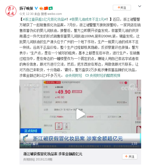 近日,浙江诸暨警方破获了一起制售假化妆品案。7月份,浙江诸暨警方接到报警称,一家网店在销售假冒伪劣的婴儿润肤油,接警后,警方立即展开侦查发现,假冒婴儿油的供货商通过一件代发的形式销售假冒婴儿润肤油100ML装和200ML装。调查发现,这批婴儿润肤油的生产源头位于广州的一个地下作坊,生产一瓶婴儿油的成本不足一块钱,远低于正品价格,整个生产过程都极其隐蔽,反侦察意识也很强。警方表示:“生产点,是在一个城郊的租房,基本上都是在后半夜,进行生产。在销售过程当中,是在旁边的一幢楼里作为一个固定的点,嫌疑人用自己假名字或者假的身份信息,跟对方进行交流,然后,把东西放在那边,用微信跟对方联系,让对方自己来取货,十分隐蔽。”最终,警方查获2万多瓶涉嫌假冒品牌的化妆品,涉案金额达到1亿3千多万元。