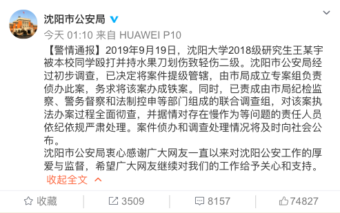 [警情通报]2019年9月19日,沈阳大学2018级研究生王某宇被本校同学殴打并持水果刀划伤致轻伤二级。沈阳市公安局经过初步调查,已决定将案件提级管辖,由市局成立专案组负责侦办此案,务求将该案办成铁案。