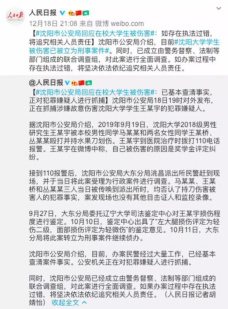据沈阳市公安局介绍,2019年9月19日,沈阳大学2018级男性研究生王某宇被本校男性同学马某某和两名女性同学王某桥、丛某某殴打并持水果刀划伤。王某宇到医院治疗时拨打110电话报警。王某宇在微博中称,自己被伤害的原因是奖学金评定纠纷。