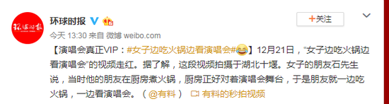12月21日,“女子边吃火锅边看演唱会”的视频走红。据了解,这段视频拍摄于湖北十堰。女子的朋友石先生说,当时他的朋友在厨房煮火锅,厨房正好对着演唱会舞台,于是朋友就一边吃火锅,一边看演唱会。