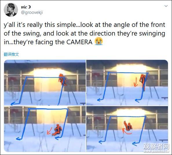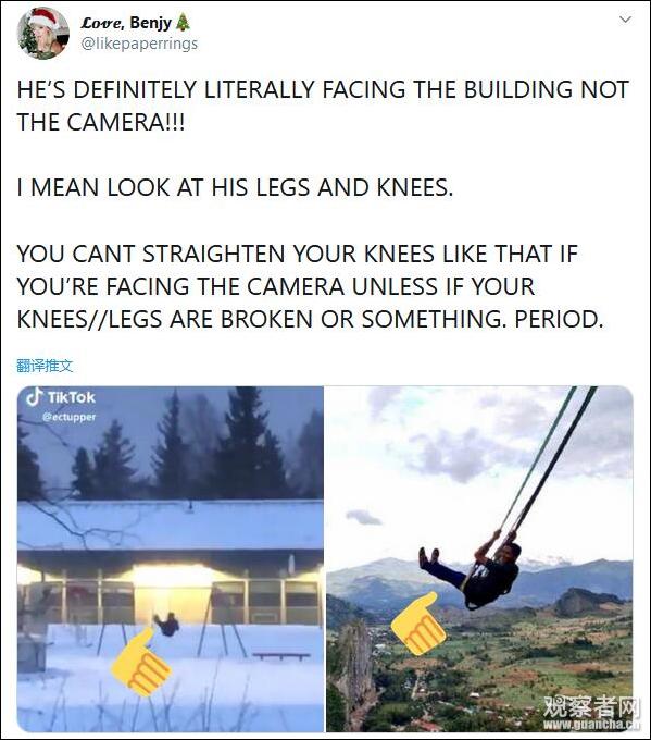 然而拍摄视频的几个人当时距离较远,于是就此人荡秋千的方向发生了争执。有人坚持他是背朝镜头荡的,但也有人觉得他肯定是面朝镜头的。