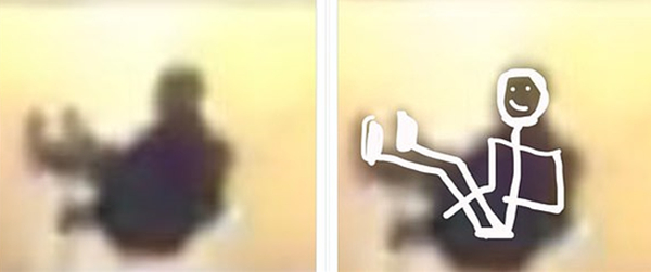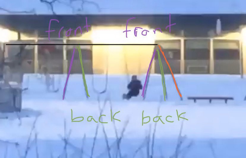 视频中的人在荡秋千的过程中,横着的杆在某一点遮住了他的脸——如果人背对镜头,这是不可能发生的。