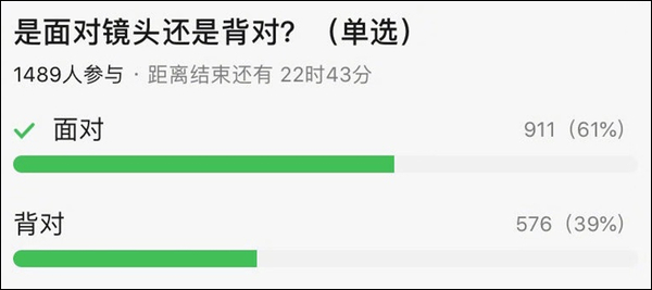 在超过5万人参与的、由BuzzFeed发起的投票中,同意“面向镜头”的人有29600人,另一方则有27600人。