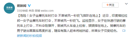 印度女子坐摩托车时打伞 被风一秒吹飞摔趴在地