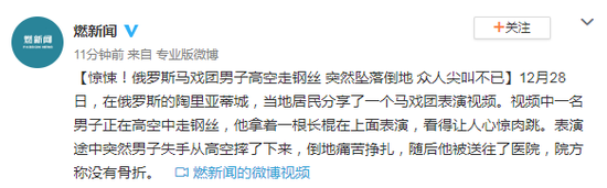 12月28日,在俄罗斯的陶里亚蒂城,当地居民分享了一个马戏团表演视频。视频中一名男子正在高空中走钢丝,他拿着一根长棍在上面表演,看得让人心惊肉跳。表演途中突然男子失手从高空摔了下来,倒地痛苦挣扎,随后他被送往了医院,院方称没有骨折。