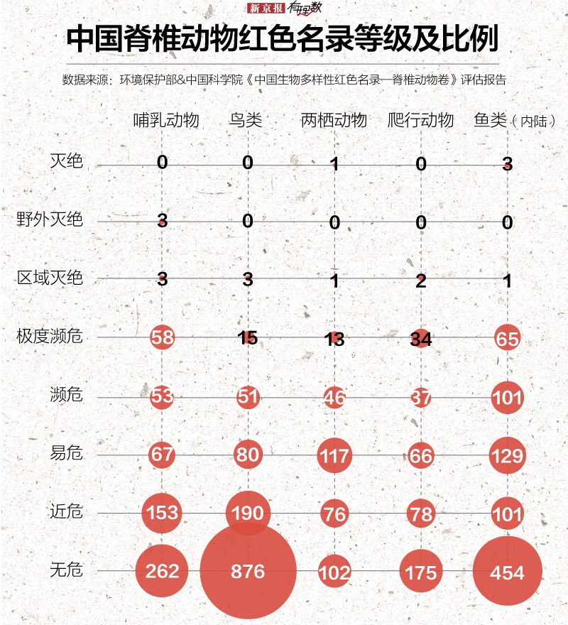 比较起来,两栖动物里只有滇螈为灭绝等级,而哺乳动物、鸟类、爬行类都没有物种灭绝。