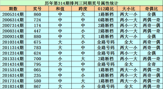 历史上第2019314期排列三已开出14期奖号了,历年同期奖号分别为:860、724、174、447、880、675、783、624、700、795、065、235、580、867,详细统计见下表: