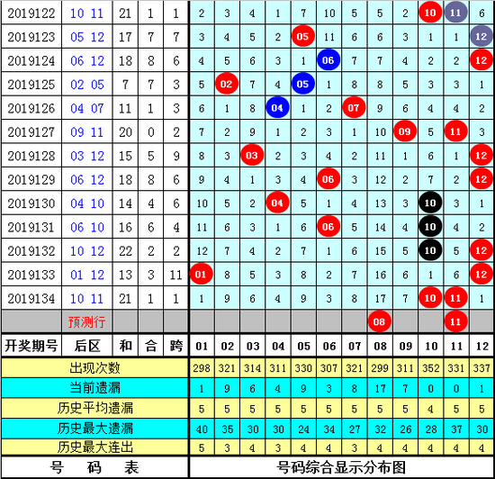 和值跨度:上期和值开出49,对比第2019133期和值下降了51个点位,本期看好和值走小,关注小号区域和值,预计在57-67区间开出。