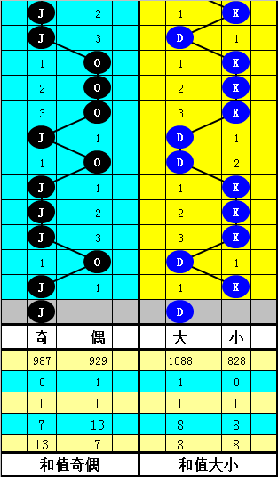 和值奇偶:最近10期和值奇偶比为5:5,其中奇偶和值开出次数相等,上期开出奇数和值之后,本期看好奇数和值重复开出。