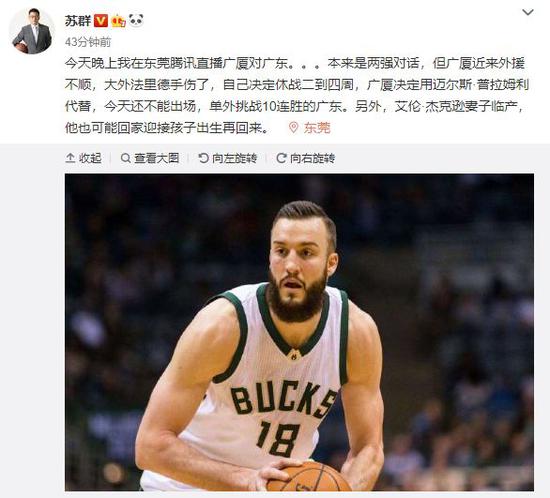 著名篮球评论员苏群也在微博上透露:法里德因为手腕伤势自己决定休战2-4周,广厦决定用迈尔斯-普拉姆利代替。而小外援杰克逊则是由于妻子临产,很可能回家迎接孩子出生后再回来。