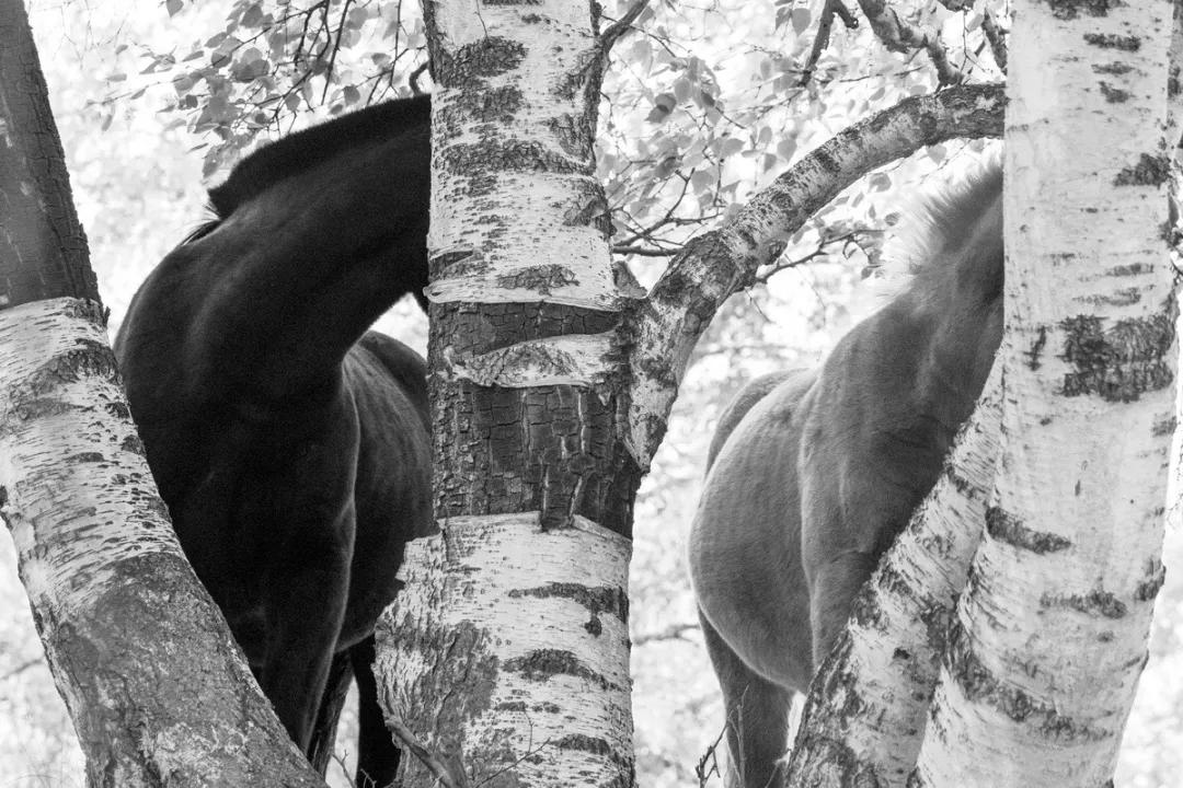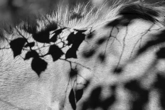 这三张照片是利用马与环境的空间构成拍摄的抽象的作品。虽然看不见马的整体形象,但你能感受到它动如脱兔,轻松、自由而又张扬的性情。《落在马背上的树叶》一张,是几片树叶的影子,是虚象。虚相实相均非真相,真相是不可见的。这是不是有点禅学的意味呢?