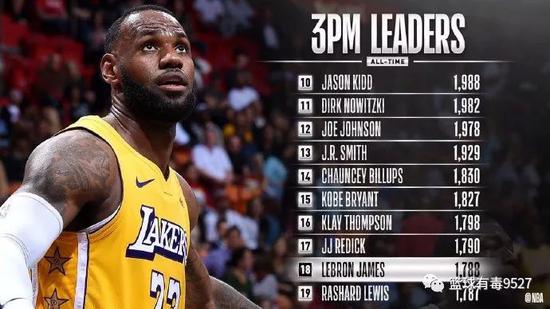 当然了,多亏老詹投进4个三分球,使得他生涯常规赛三分球命中数来到1788个,超越刘易斯,升到历史第18位,排在老詹身前的是雷迪狗。