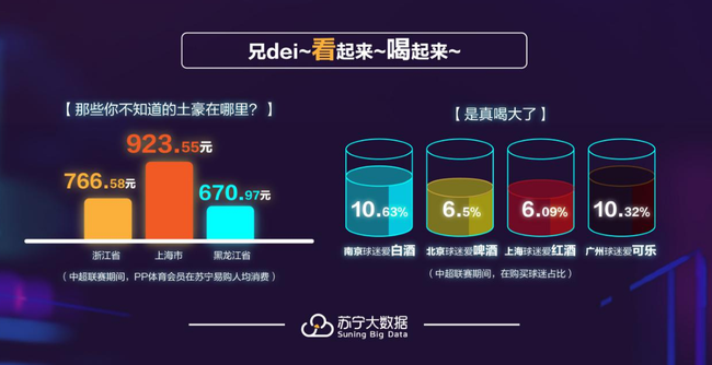 依托赛事直播和电商平台的联动,赛事期间PP体育推出“进球红包雨”互动活动,共发出9133.6万个红包,2019年苏宁体育会员的消费能力也显示出惊人的提升。数据显示,在中超赛事期间,PP体育会员在苏宁易购人均消费TOP3的省份和直辖市依次为上海市、浙江省和黑龙江省,消费额分别达到923.55元、766.58元和670.97元。