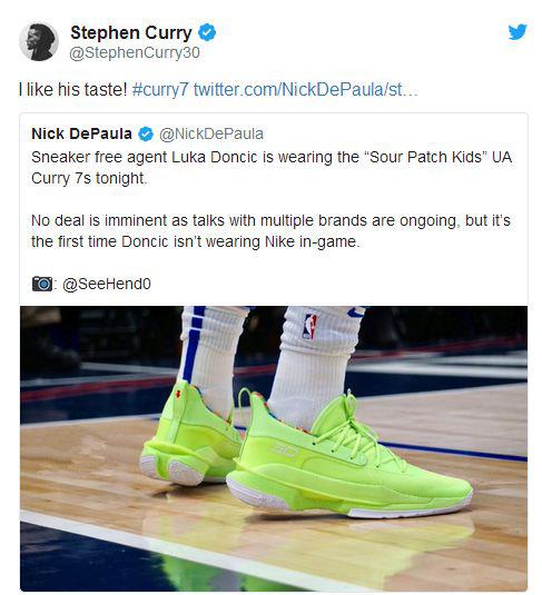 对阵马刺的比赛东契奇穿上库里7荧光绿。萌神库里也第一时间在社交媒体上为他点赞:“我喜欢他的品味。”这波操作让安德玛跟东契奇的关系变得非常暧昧。