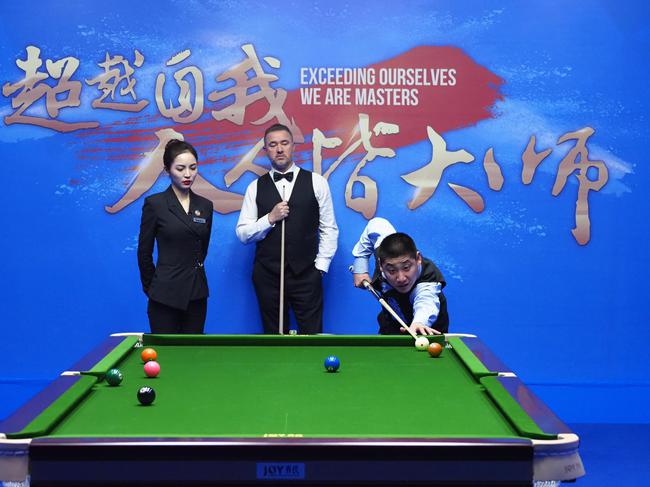 1月6日晚,秦皇岛银行·乔氏杯 第八届中式台球国际大师赛全球总决赛的八分之一比赛结束后,象征总决赛梦想和荣耀的主TV台并没有谢幕,一场中式台球国际大师赛公益比赛上演。在中式台球国际联合会名誉主席史蒂芬·亨德利、“最美台球裁判”王钟瑶的陪伴下,三位特殊的大师赛球员一步一步走进这场中式台球顶级赛事的舞台中央。