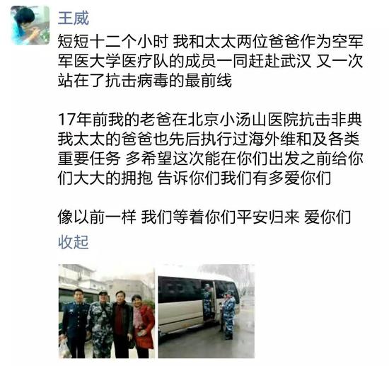 两位父亲,两个家庭的顶梁柱,两个孩子的榜样。在除夕之夜同一时刻,乘同一架飞机驰援武汉,抗击疫情,向你们致敬,盼你们凯旋!