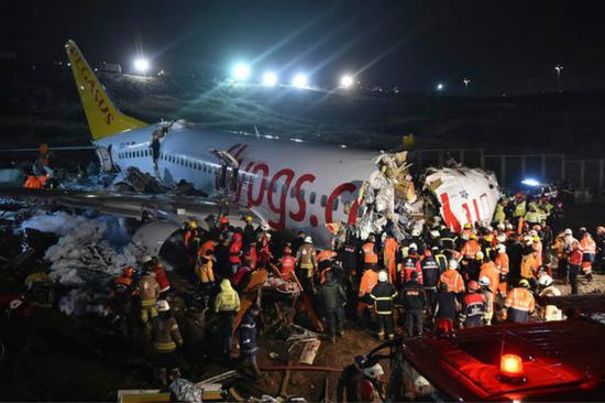 海外网2月6日电 当地时间5日,土耳其一架波音737-800客机在伊斯坦布尔萨比哈·格克琴机场滑出跑道,机体严重损坏,折成三截。土耳其卫生部宣布,事故已经造成1人死亡,157人受伤。