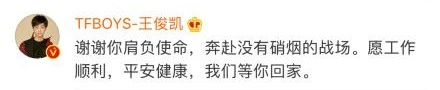 此前,一位王俊凯粉丝发文称自己将去支援武汉,王俊凯看到后回复:“谢谢你肩负使命,奔赴没有硝烟的战场。愿工作顺利,平安健康,我们等你回家。”