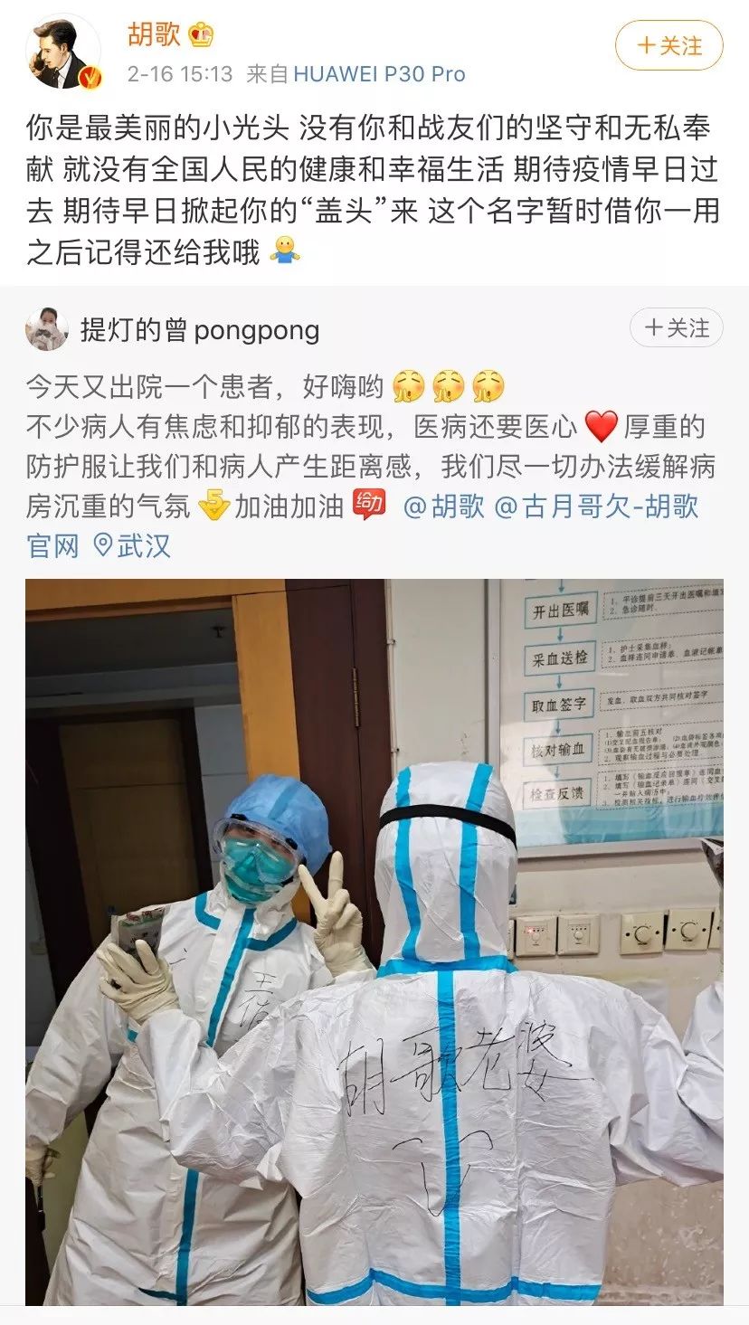 据了解,提灯的曾pongpong是广州中医药大学去武汉驰援的一位护士。她发了这条微博后,很多胡椒(胡歌粉丝名)纷纷为她点赞,“胡歌老婆的名分先让给你,注意安全,平安”“可爱的胡椒,辛苦了,听你老大的话救治病人的同时,也请保护好自己”。