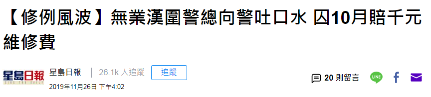 大批暴徒曾于6月26日围堵香港警察总部,其中一名43岁无业游民当时喷污警署玻璃门,还向警员吐口水。据港媒报道,他25日承认袭警、刑事毁坏、非法集结等三项罪名,于26日被判处10个月有期徒刑,并须赔偿警方1670港元维修费(约合人民币1500元)。对其吐口水行为,法官斥责:肮脏、污秽、卑鄙且传播细菌。