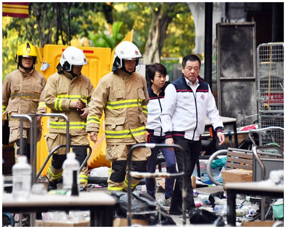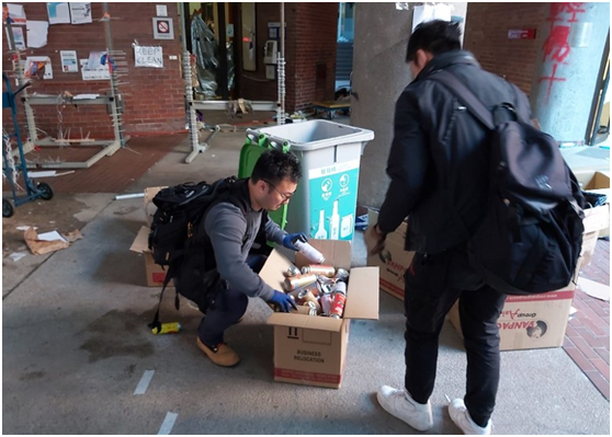香港消防处28日称,校内有大量危险化学品,初步点算怀疑有超过550公升属于第五类危险品的易燃液体、20公升属于第三类危险品的腐蚀性液体、80公升属第四类危险品的有毒物质及其他危险品,实验室也曾被人破坏及闯入,危险仓内15支灭火筒也被人取去,校内不少消防设备被破坏。