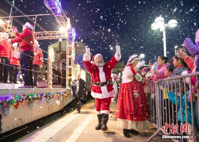 当地时间2019年12月8日,一列装饰着圣诞元素的通勤火车驶进美国旧金山湾区米尔布雷站,吸引数百位当地民众观看。 中新社记者 刘关关 摄