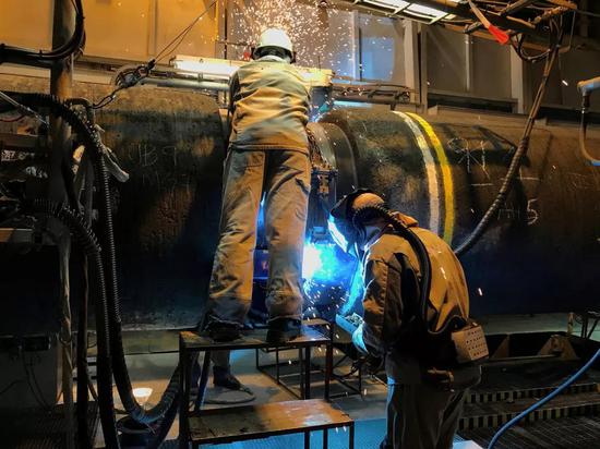 (工作人员正在铺设“北溪2号”天然气管道的船只上工作。新华社)
