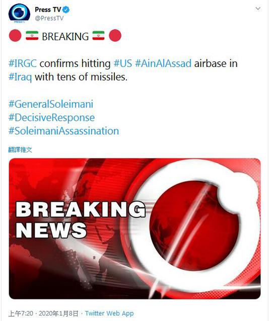伊朗“Press TV”7日消息说,伊朗伊斯兰革命卫队证实以数十枚导弹袭击美国在伊拉克的阿萨德空军基地。Press TV称,美国官员确认,包括美军驻伊拉克基地在内的多个美国军事据点遭到攻击。