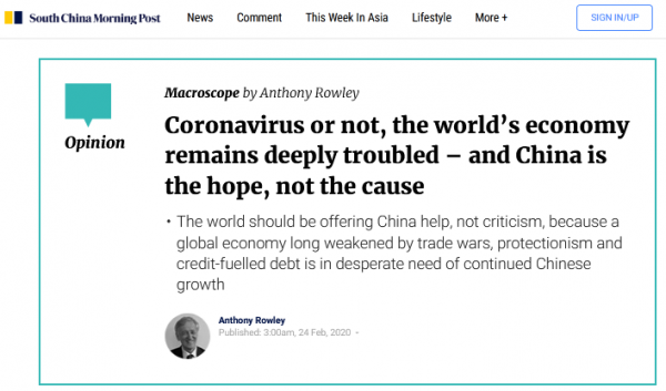 2月24日《南华早报》刊文《不管有没有新冠肺炎,世界经济仍是深陷泥潭——中国是希望,不是问题根源》